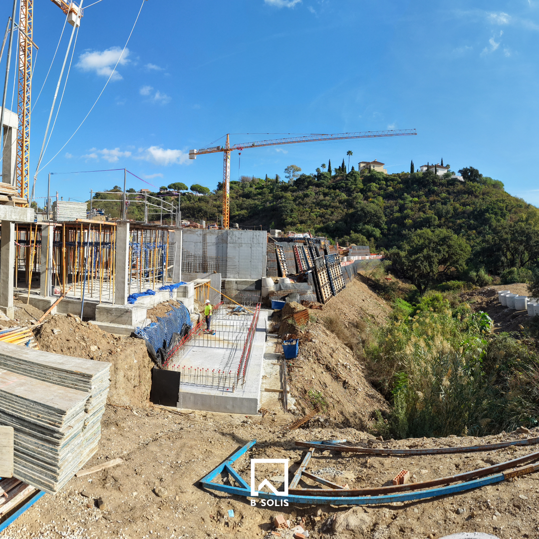 También se avanza en la configuración de muros de contención y saneamiento, fundamentales para adaptar las edificaciones a la topografía natural del terreno, caracterizada por desniveles que ofrecen vistas únicas hacia el mar y las montañas. Se han habilitado accesos temporales y zonas de acopio para materiales, optimizando la logística de obra en un entorno de gran valor paisajístico.